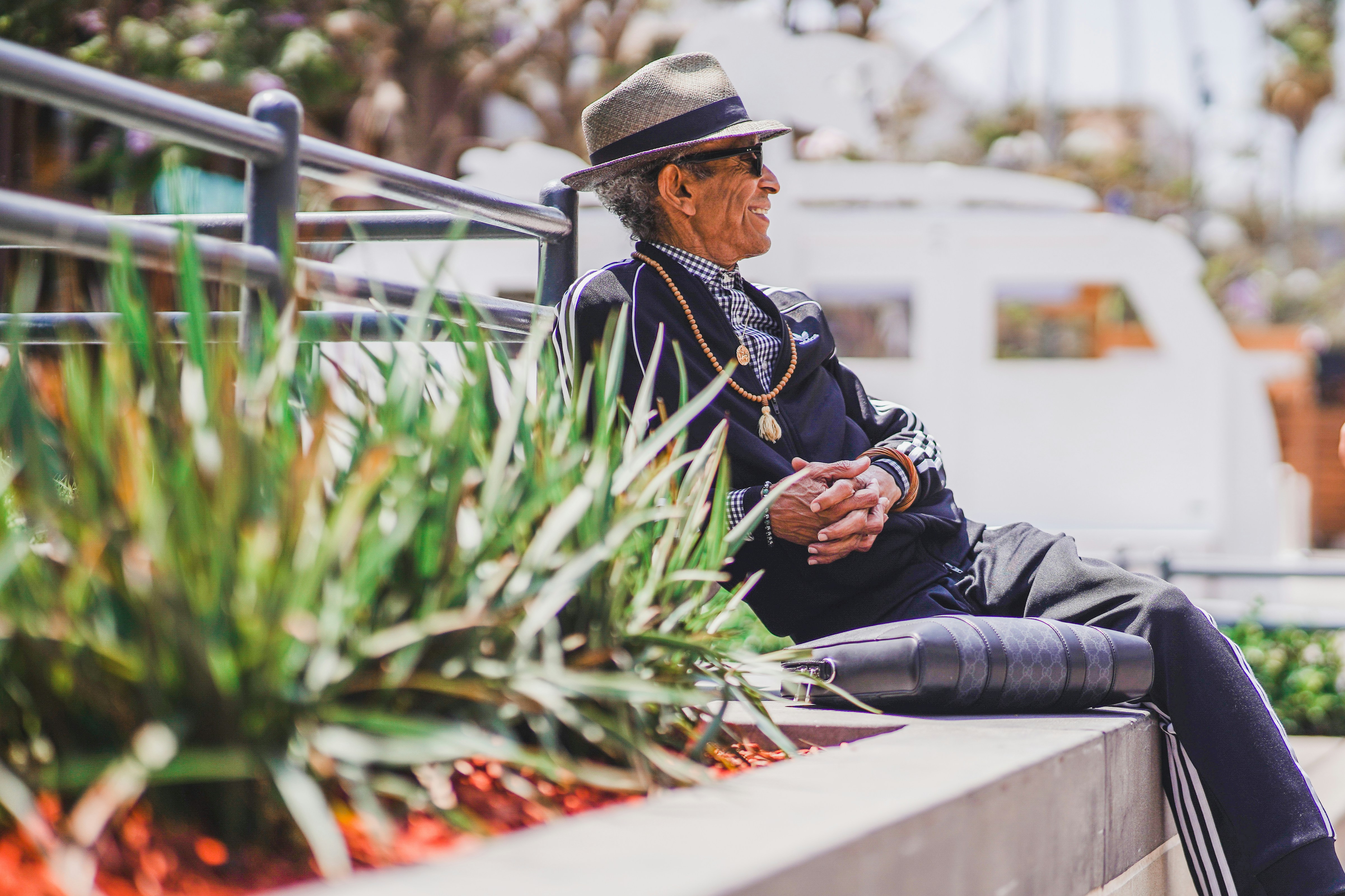 Man wearing fedora, relaxing outside with a smile on his face at the third street promenade in Santa Monica, CA