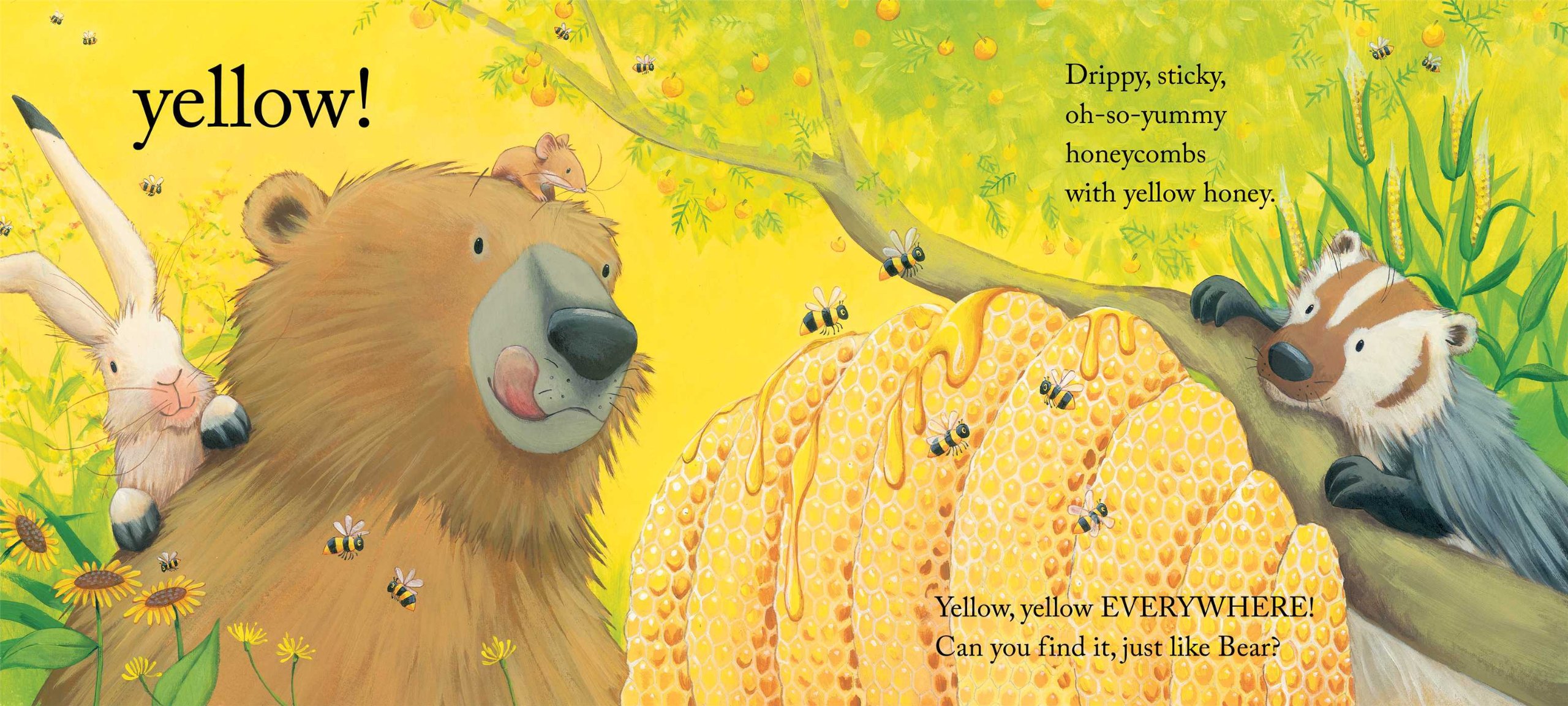 Bear Sees Colors Learning Color Concepts by Karma Wilson Start your review of Bear Sees Colors Learning Color Concepts. The starkly white page of Bear meeting a friend followed by a page lush with color and a request for you to find blue/red/etc is lovely and successful.